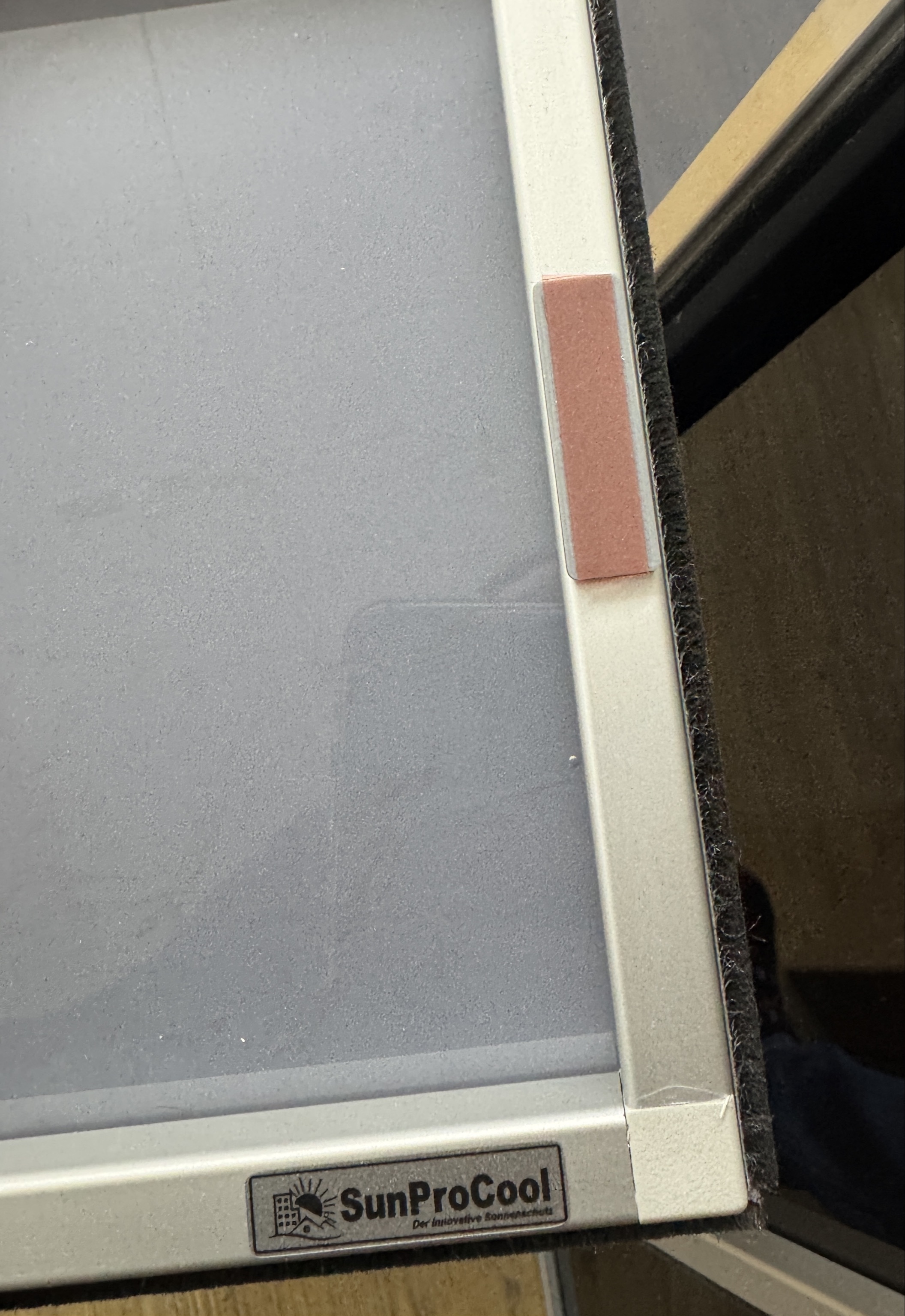 SunProCool® Profi-EXT Rahmen leicht gekippt am Fenster unten ansetzen und auf die Glasfläche von unten nach oben andrücken und ankleben.